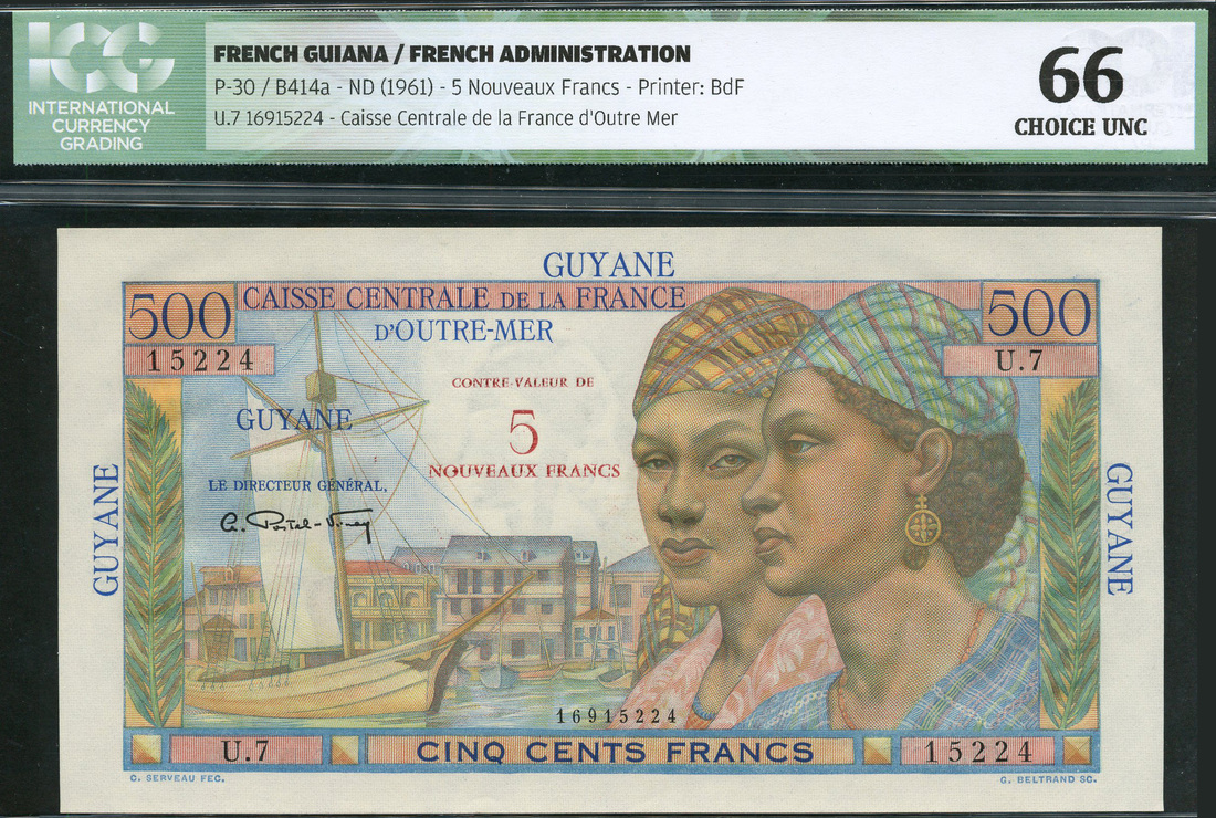 (x) Caisse Centrale de la France d'Outre-Mer, French Guiana, 5 NF on 500 francs, 'Pointe a Pitre', ND (1960-), serial number U.7 15224, pale blue and multicoloured, two ladies at right, boat and harbour at left, Postel-Vinay signature at left, red 'CONTRE-VALEUR DE 5 NOUVEAUX FRANCS' at centre, GUYANE at top centre and in left and right margins, reverse multicoloured, two bullock carts with harvest, blue GUYANE in margins