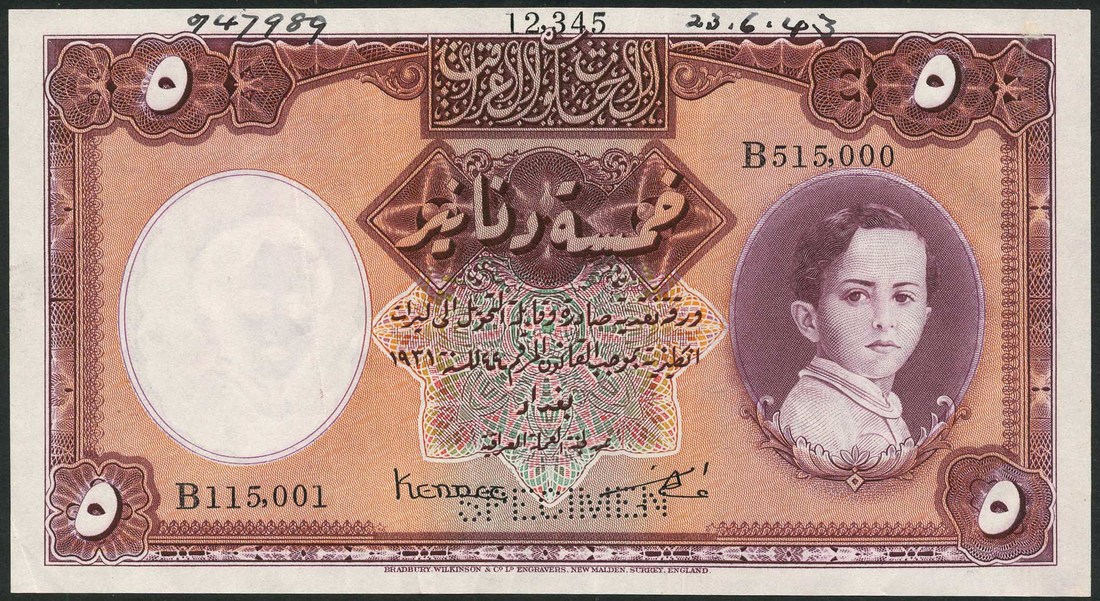 (x) Government of Iraq, specimen 5 dinars, law of 1931 (1942), serial number B 115001-B515000, purple, pink-brown, lilac and green, King Faisal II as a child at right, value at each corner, signatures of Kennett and Ata Amin low centre, reverse violet and white, value at left