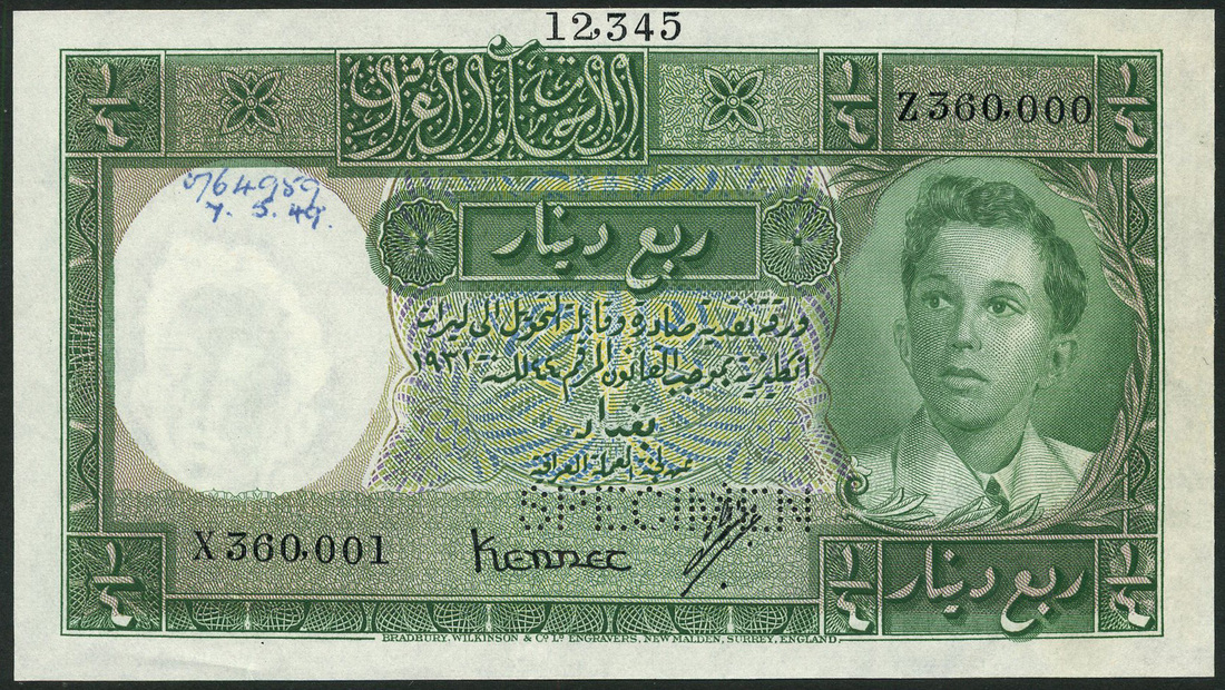 (x) Government of Iraq, specimen 1/4 dinar, law of 1931 (1948), serial number X 360001-Z 360000, green, lilac and yellow, King Faisal II as a youth at right, value at each corner, signatures of Kennett and al Khudairi low centre, reverse violet and white, value at left