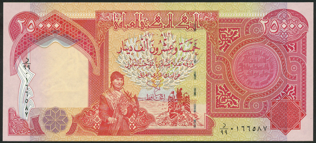 (x) Central Bank of Iraq, aa group of replacement notes comprising, 5000 dinars (4), blue and multicolour, waterfall at centre, 10000 dinars (4), green, portrait Abu Ali al-Hasan ibn al-Hasan ibn al-Haytham at right, and, 25000 dinars (4), two with consecutive serial numbers 166587/8, red, Kurdish farmer at centre