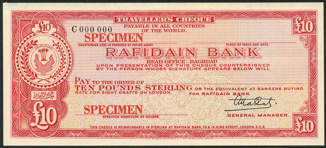 (x) Rafidan Bank, specimen £10 travellers cheque, red, arms at left