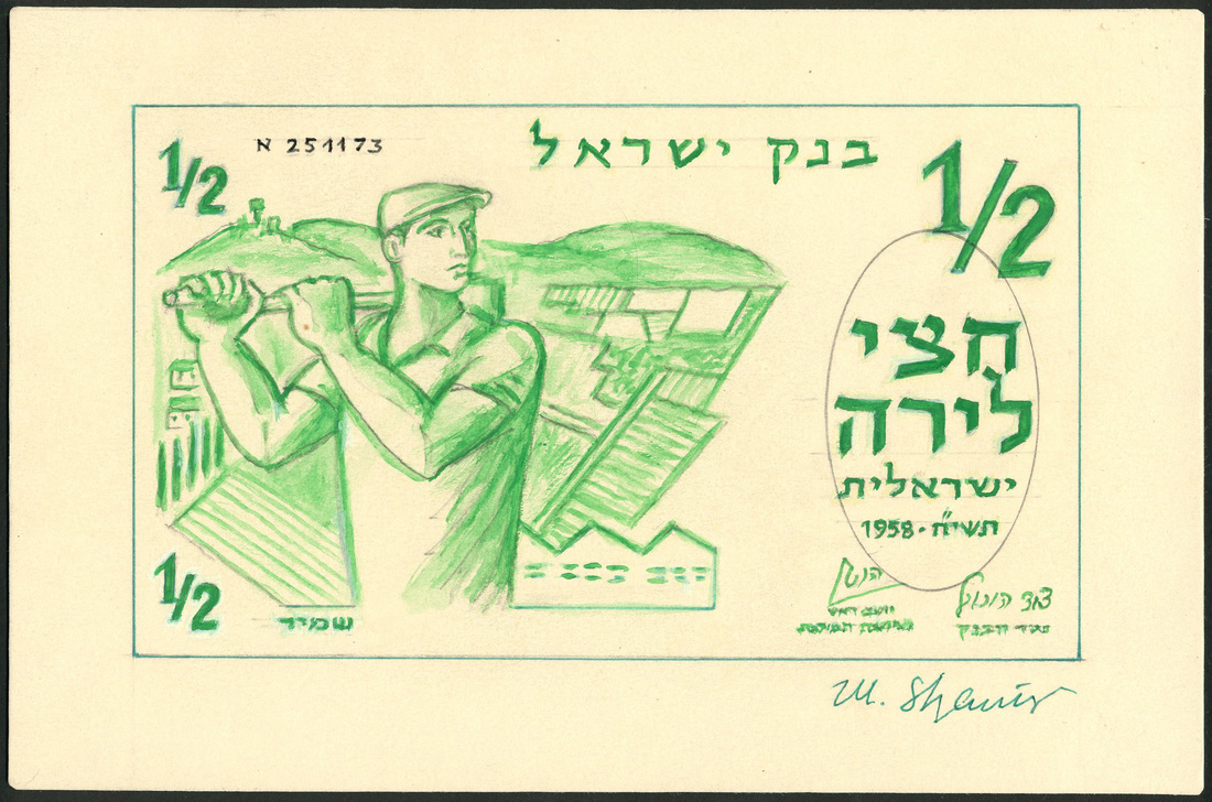 (x) Bank of Israel 'Ideal figures' series, a hand executed essay on board for a 1/2 lira, 1958, serial number 297420, green and white, allegorical male figure at left, background of cultivated fields almost identical to the adopted design with 'female soldier', signature of Nebenzahl low right