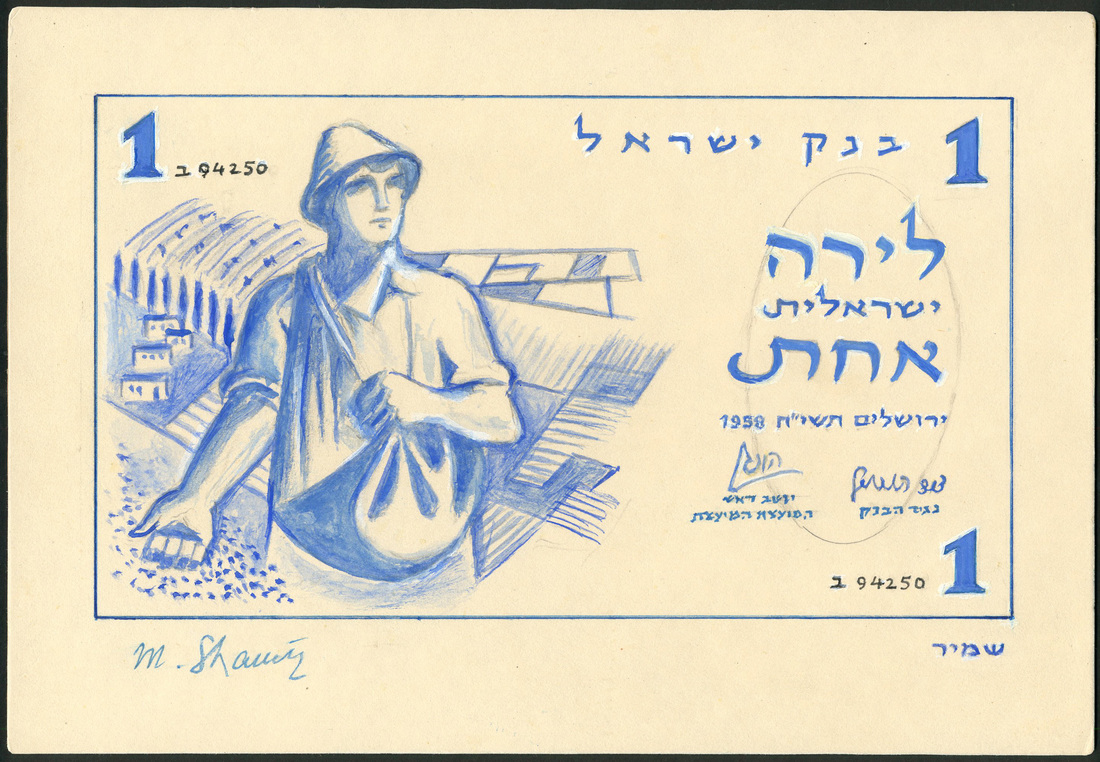 (x) Bank of Israel 'Ideal figures' series, a hand executed essay on board for a 1/2 lira, 1958, serial number 94250, blue and white, farmer sowing seed at left, background of cultivated fields as on the previous lot and on the final approved design, signature of Nebenzahl low right