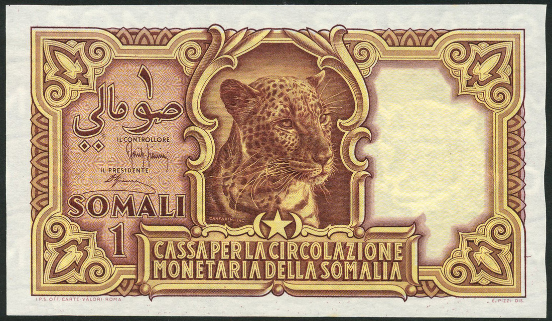 Cassa per la Circolazione Monetaria della Somalia, 1 somali, 1950, serial number A011 000474, yellow and brown, Leopard at centre, values at left, reverse, value at centre
