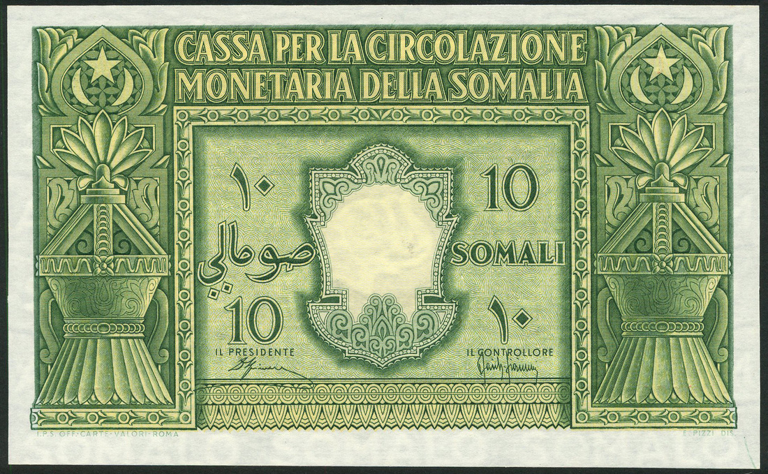 Cassa per la Circolazione Monetaria della Somalia, 10 somali, 1950, serial number A009 093956, yellow and green, Somali fireplace at left and right, topped with stars and moons, values at centre right and left, reverse, value at left and right