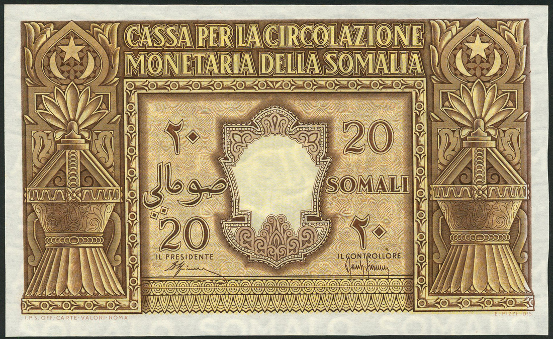 Cassa per la Circolazione Monetaria della Somalia, 20 somali, 1950, serial number A008 094856, yellow and brown, Somali fireplace at left and right, topped with stars and moons, values at centre right and left, reverse, value at left and right