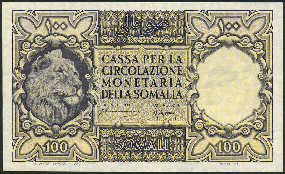 Cassa per la Circolazione Monetaria della Somalia, 100 somali, 1950, serial number A003 006005, yellow and purple, Lion at left, value at each corner, reverse Government building in Mogadishu at centre right