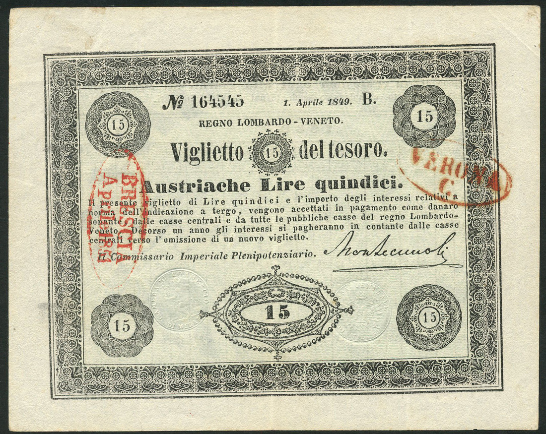 Regno Lombardo Veneto-Viglietto del Tesoro, 15 lire, 1 April 1849, serie B, serial number 164545, black text on pale green and cream paper, value in circular guilloche top and low centre and at each corner, printed signature below and two embossed seals in field with crowned double headed Austro-Hungarian eagles, reverse calendar