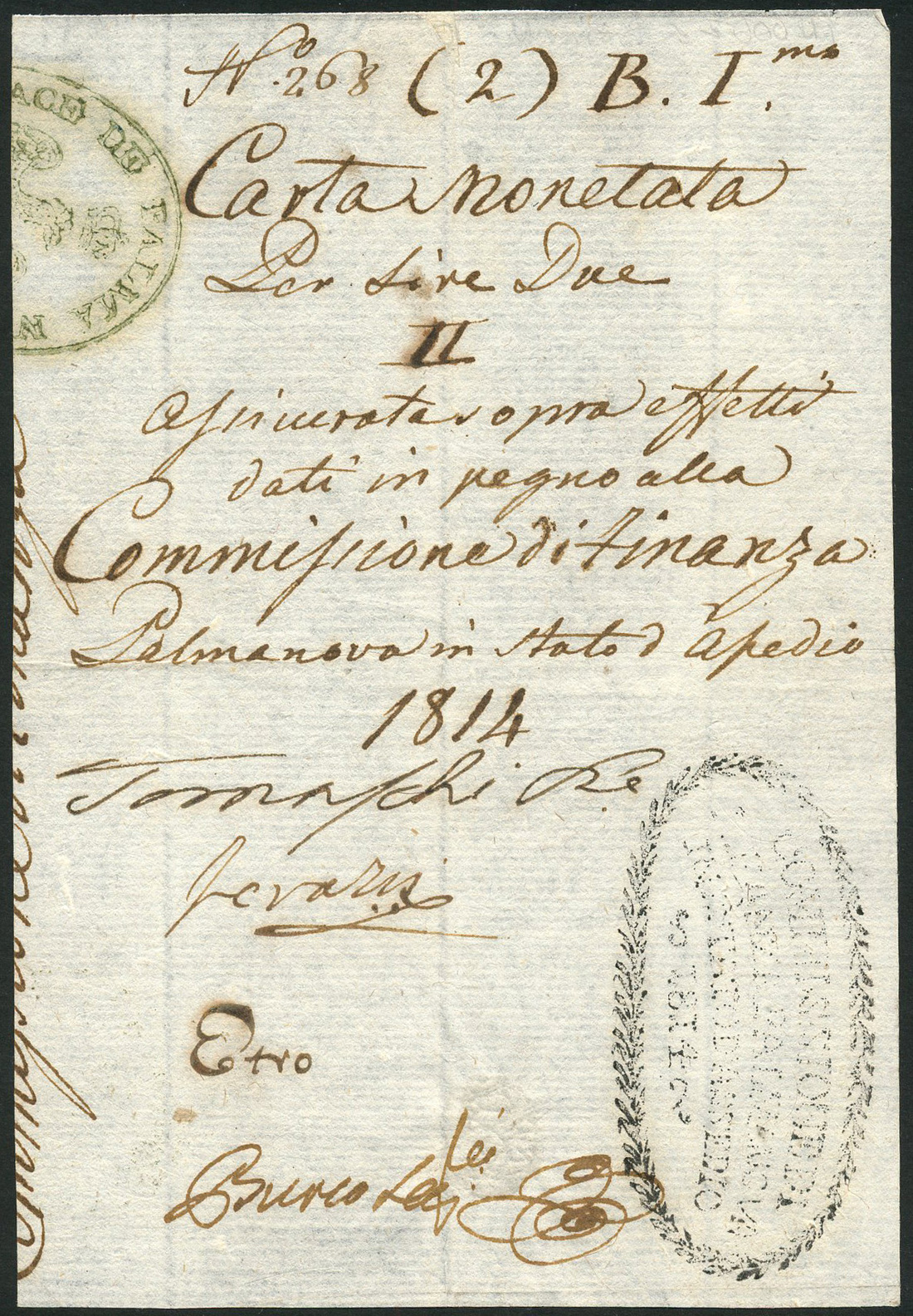 Assedio de Palmanova, 2 lire, 1814, serial number 268, manuscript black text on cream parchment like paper, two handstamps, one with French Imperial eagle and one laureate and dated 1814