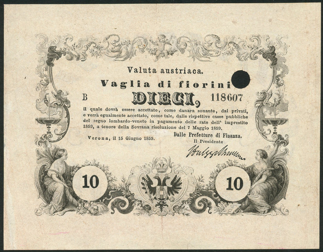 Valuta Austrianae, Verona, 10 fiorini, Verona, 15 June 1859, serial number B 118607, black and white, allegorical woman seated low centre, ornate border of allegorical symbols of trade and prosperity at left and right, double headed Austo-Hungarian Imperial eagle low centre, printed signature low right