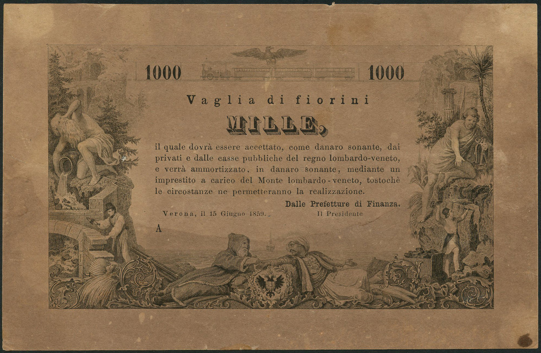 Valuta Austrianae, Verona, 1000 fiorini, Verona, 15 June 1859, series A, black and white, allegorical woman seated low centre, ornate border of allegorical symbols of trade and prosperity at left and right, double headed Austo-Hungarian Imperial eagle low centre, printed signature low right