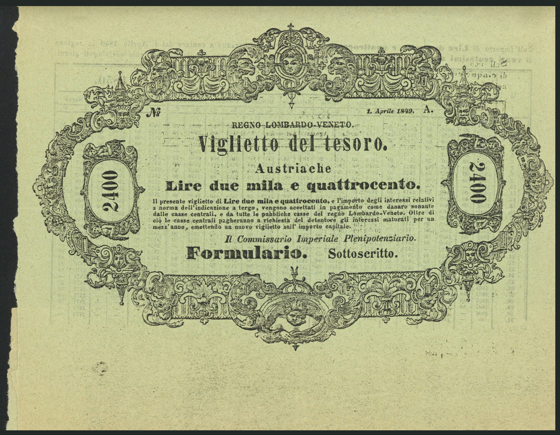 Formulario, Regno Lombardo-Veneto, unissued 600, 1200 and 2400 lire, 1 April 1849, black text on green paper
