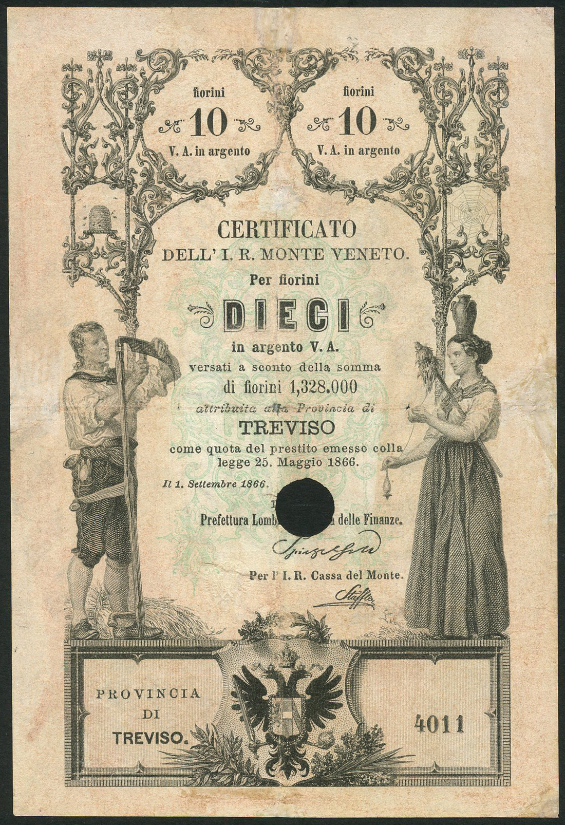 Dell' I.R.Monte Veneto, Italy, 10 fiorini, 25 May 1866, serial number 4011, black and white with a pale blue central panel, farmer at left, woman at right, double headed Austro-hungarian Imperial eagle low centre, two printed signatures low centre, reverse green, interest chart