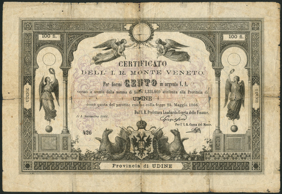 Monte Veneto, Provincia di Udine, a forced loan certificate for 100 lire, 25 May 1866, serial number 426, black text on white with mauve central background panel. Angel at left and right and two angels with wreath top centre, double headed Austro-Hungarian Imperial eagle flanked by mythical creatures low centre