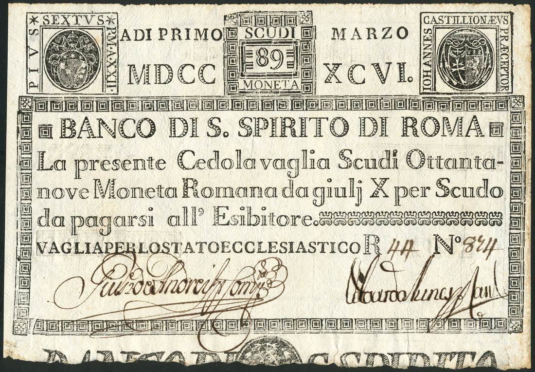(x) Banco Di S Spirito Di Roma, 89 scudi, 1786-96, serial number 874, black print on white watermarked paper, value at top centre flanked by arms, manuscript signature at low left and right