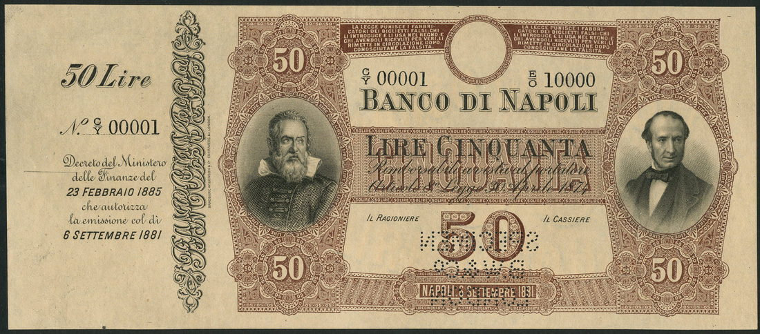 (†) Banco di Napoli, specimen 50 Lire, with counterfoil, 6 September 1881, serial number C/Y 00001-E/O 10000, brown and black, portrait of Galileo at left, Manna at right, value in guilloches in each corner, reverse brown, value and bank title