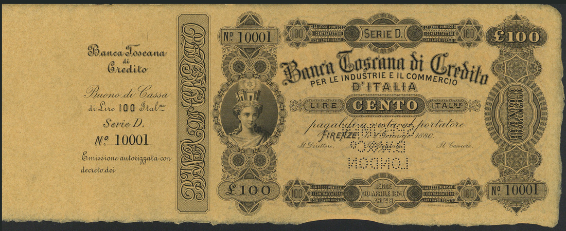 (†) Banca Toscana di Credito, Italy, specimen 100 lire with counterfoil, 2 January 1880, serial number 10001, black on tan paper, head of Italia at left, value at corners, reverse red, value at centre and corners