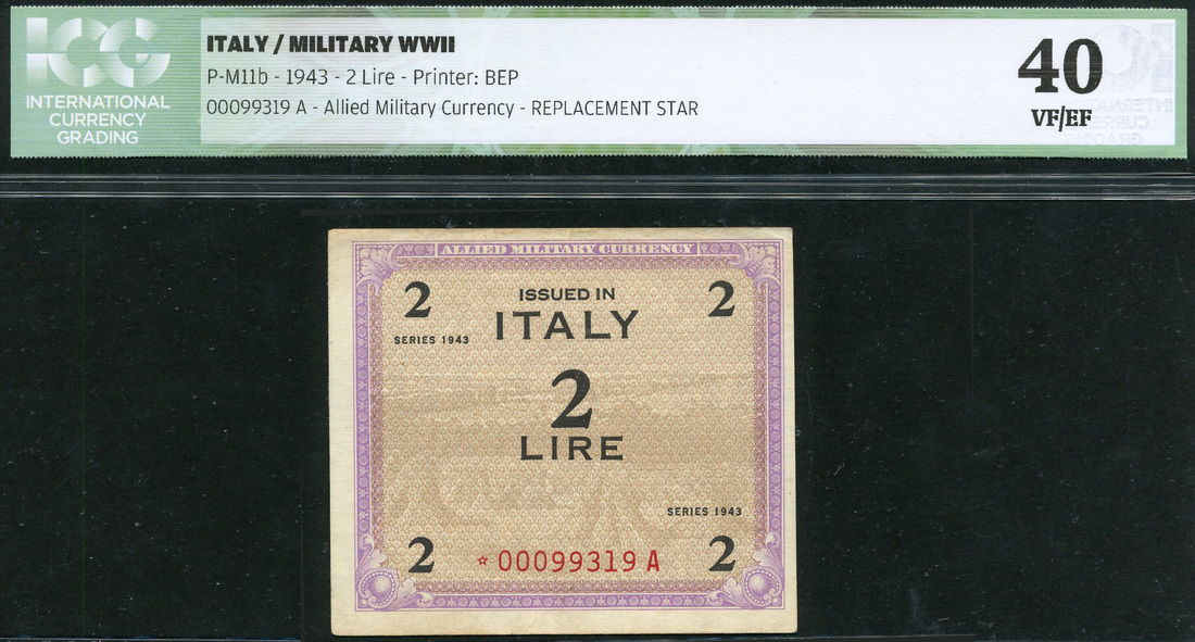 Allied Military Currency, Italy, replacement 2 lire, 1943, serial number *00099319A, violet on brown, reverse blue