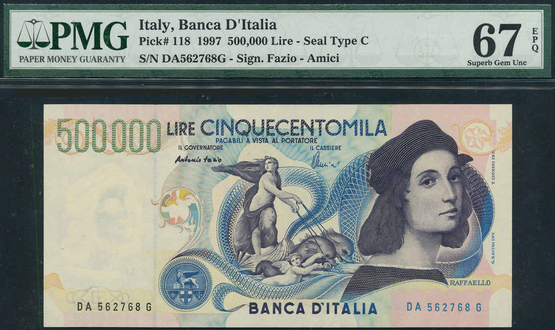 (x) Banca d'Italia, 500,000 lire, 1997, serial number DA 562768 G, purple and blue, Raphael at right, painting of 'Triumph of Galatee' at centre, reverse blue, school of Athens, Faizo and Amici signatures
