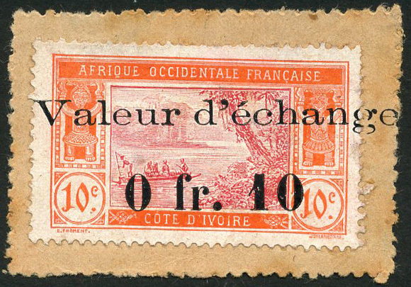 (x) Afrique Occidentale Francaise, Cote D'Ivoire, postage stamp currency for 10 centimes, ND (1920), red stamp on tan card, oarsmen in canoe on a river, black overprint 'Valeur d'echange 0fr.10'