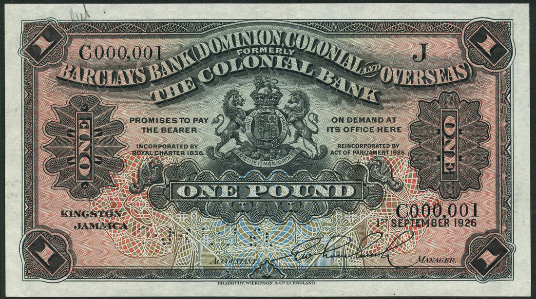 (†) Barclays Bank (Dominion, Colonial and Overseas), Jamaica, specimen proof £1, ND (1926), no serial numbers, no signatures, no letter at upper right; also specimen £1, 1 September 1926, serial number C000,001, signed by Manager at lower right, Letter 'J' for Jamaica at upper right, both black on blue-green and pink underprint, coat of arms at centre, value in guilloches at left and right and in four corners, reverse dark green and pale green, arms at centre, perforated CANCELLED