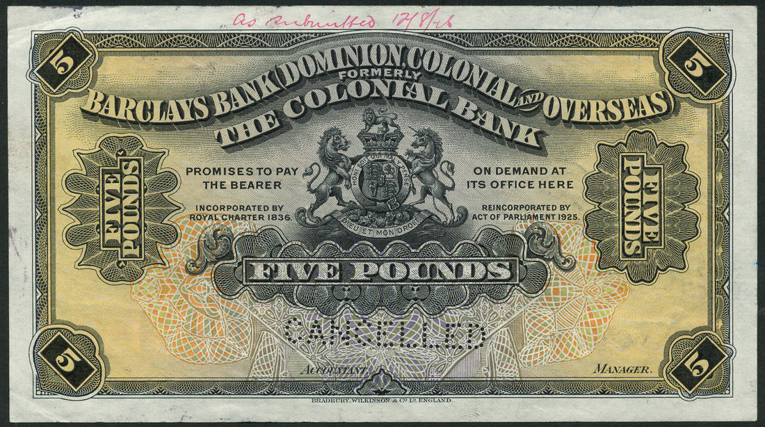 (†) Barclays Bank (Dominion, Colonial and Overseas), Jamaica, specimen proof £5, ND (1926), no serial numbers, no signatures, no letter at upper right; also specimen £5, 1 September 1926, serial number C000,001, signed by Manager at lower right, Letter 'J' for Jamaica at upper right, both black on grey and yellow underprint, coat of arms at centre, value in guilloches at left and right and in four corners, reverse blue, pale blue and pale green, arms at centre, perforated CANCELLED