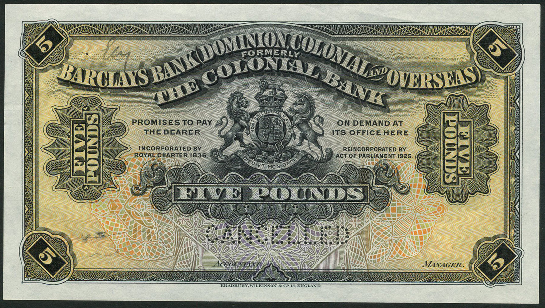 (†) Barclays Bank (Dominion, Colonial and Overseas), Jamaica, specimen proof £1, ND (1926), no serial numbers, no signatures, no letter at upper right, black on blue-green and pink underprint, reverse dark green and pale green; also specimen proof £5, ND (1926), no serial numbers, no signatures, no letter at upper right, black on grey and yellow underprint, reverse blue, pale blue and pale green, both coat of arms at centre, value in guilloches at left and right and in four corners, perforated CANCELLED