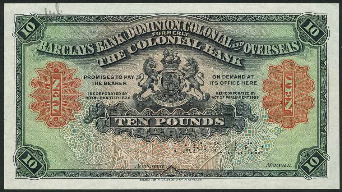 (†) Barclays Bank (Dominion, Colonial and Overseas), Jamaica, specimen proof £10 (2), ND (1926), the first black on lilac and green underprint, the second black and red on lilac and green underprint, both no serial numbers, no signatures, no letter at upper right, coat of arms at centre, value in guilloches at left and right and in four corners, reverse salmon-pink on pale pink underprint, arms at centre, perforated CANCELLED