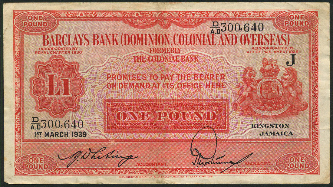 Barclays Bank (Dominion, Colonial and Overseas), Jamaica, £1, 1 March 1939, Kingston, serial number D/AD 300640, red on multicolour underprint, arms at right, value at left, centre and each corner, reverse red, arms at centre