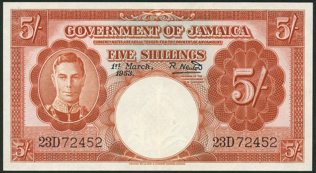 Government of Jamaica, 5 shillings, 1 March 1953, prefix 23D, orange-brown, George VI at left, value at right, Newton signature, also Bank of Jamaica, 5 shillings, ND (1967), prefix GB, red and pale lilac, Elizabeth II at left, Brown signature