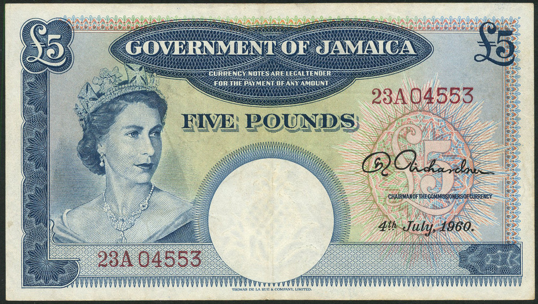 Government of Jamaica, £5, 4 July 1960, maroon serial number 23A 04553, blue and multicoloured, Elizabeth II at left, value at right and top left and right, Richardson signature, reverse blue and white, bauxite mine