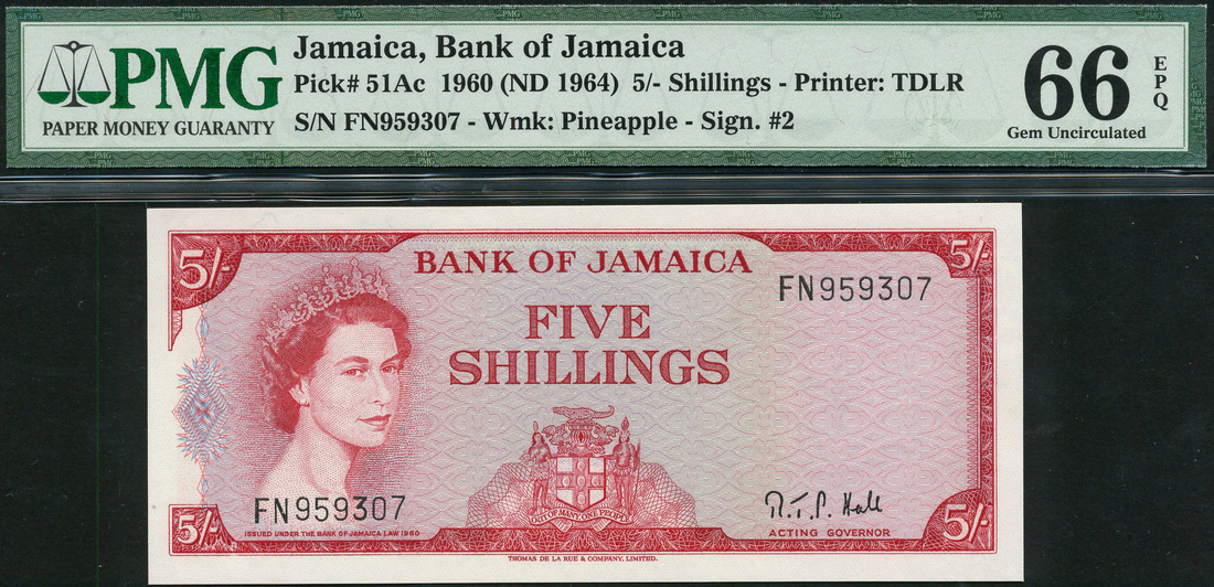 Bank of Jamaica, 5 shillings, ND (1964), serial number FN 959307, red, portrait Queen Elizabeth II at left, arms low centre, bank title top centre, value in each corner and at centre, ornate border, reverse, Dunn's River Falls