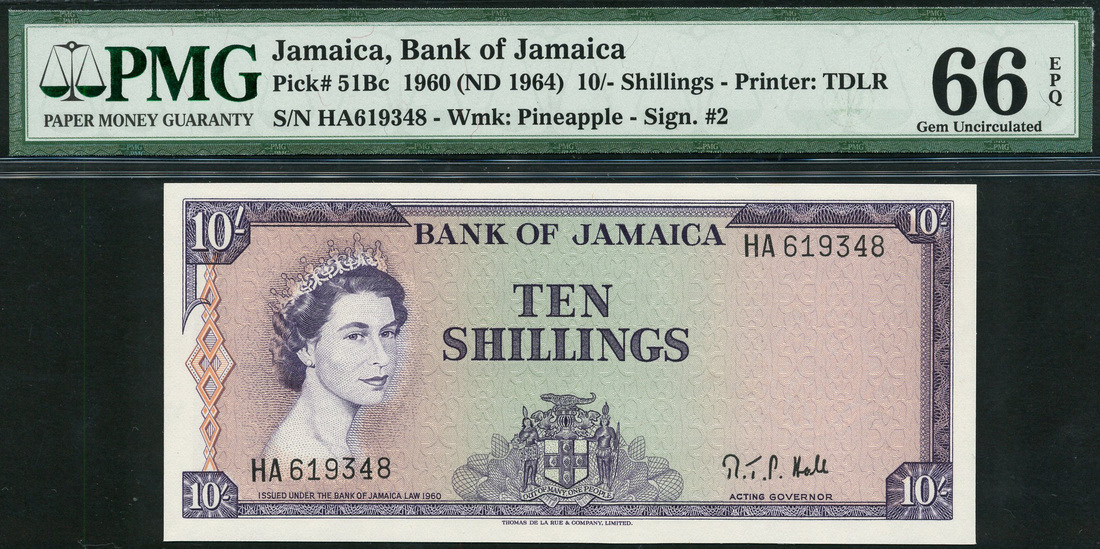 Bank of Jamaica, 10 shillings, ND (1964), serial number HA 619348, purple on light green and tan underprint, portrait Queen Elizabeth II at left, bank title top centre, value in each corner and at centre, arms low centre, reverse, men loading bananas on to boats