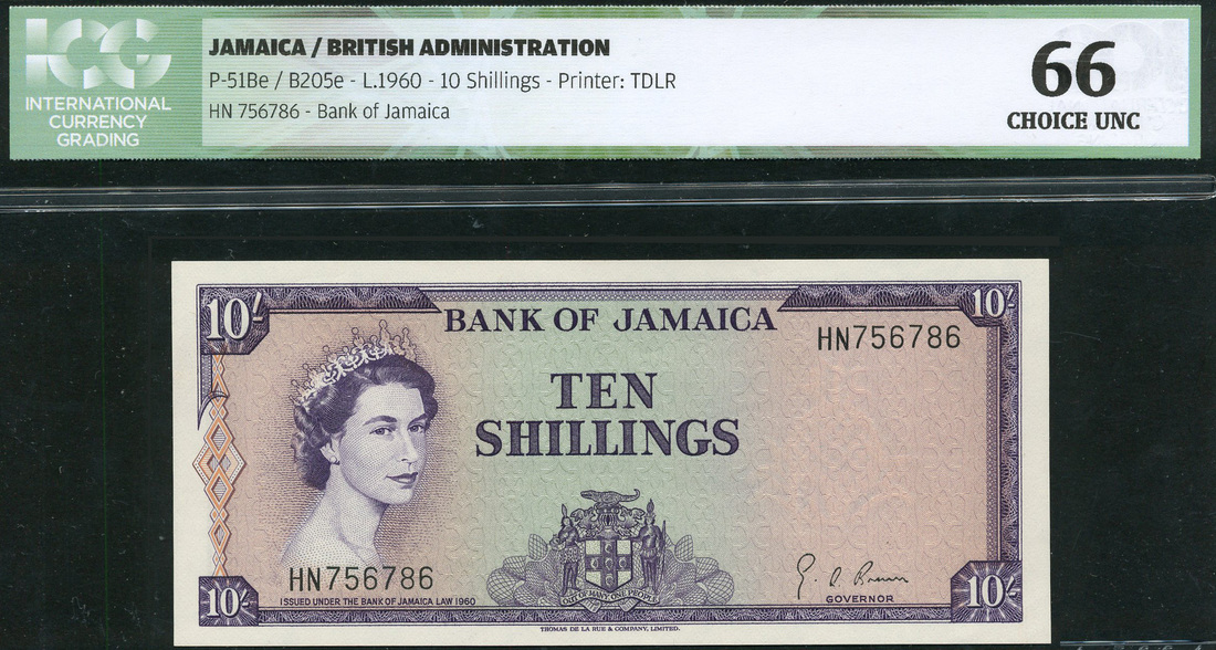Bank of Jamaica, 10 shillings, ND (1964), serial number HN 756786, purple om pale orange and green, portrait Queen Elizabeth II at left, arms low centre, value in each corner and at centre, reverse, boats being loaded with banana harvest, boats and palm trees in background