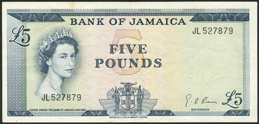 Bank of Jamaica, £5, ND (1963), serial number JL 527879, blue-grey on light orange and yellow underprint, portrait Queen Elizabeth II at left, bank title top centre, value top left, centre and low right, coat of arms low centre, reverse, industrial park, woman holding fruit at right