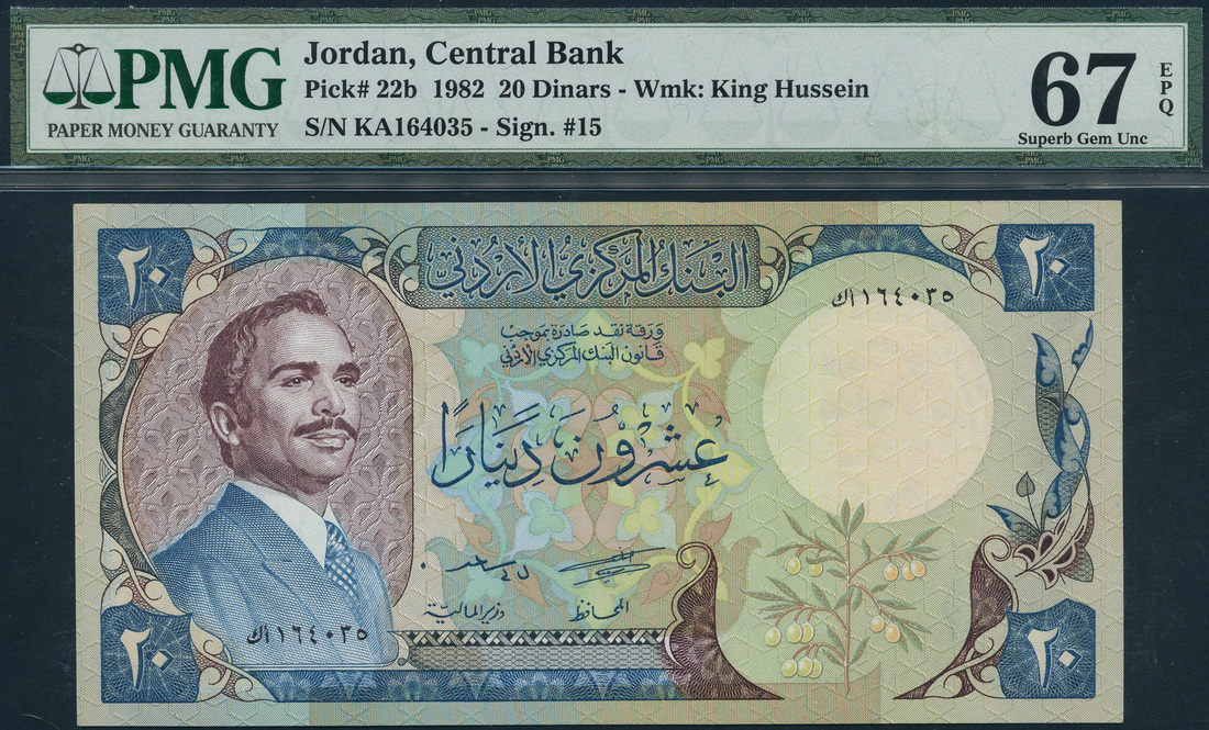 (x) Central Bank of Jordan, 20 dinars, 1982, serial number KA164035, brown, blue and green, King Hussein at left, olive branch at right, reverse blue, power station in Zerqa, Salem Massadeh and Said Al Nabulsi signatures
