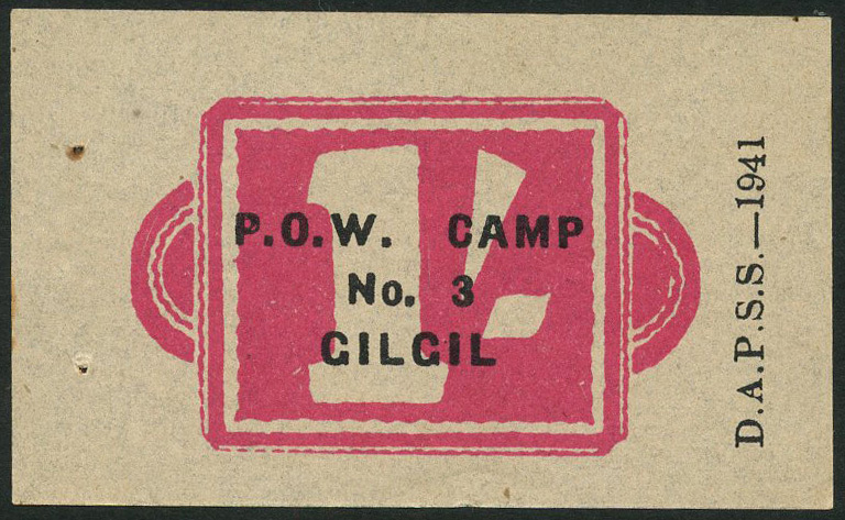 Kenya, Gil-Gil P.O.W Camp No. 5, a set comprising 5 cents, purple, 10 cents, green, 25 cents, light pink, 50 cents, blue, 1/-, dark pink, all POW CAMP No. 3 Gilgil in coloured panel at centre, dates D.A.P.S.S-1941 at left