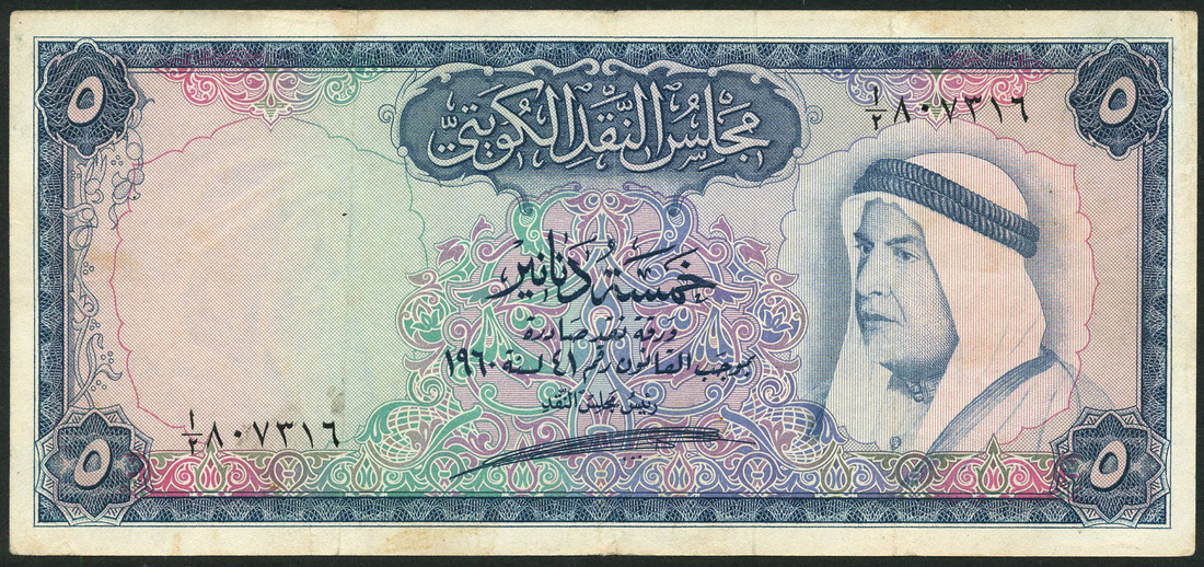 (x) Kuwait Currency Board, 5 dinars, ND (1961), blue on multicolour underprint, Sheikh Abdullah Al-Salem Al-Sabah at right, value in each corner, ornate border, reverse, street scene