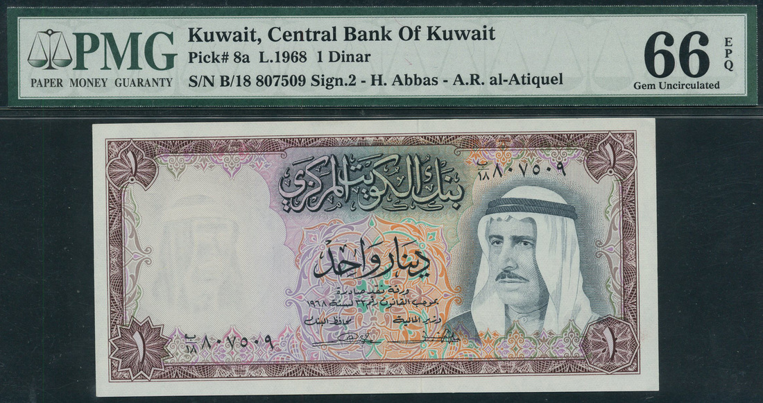 (x) Central Bank of Kuwait, 1 dinar, ND (1971), serial number B/18 807509, purple and multicolour, portrait Sheikh Sabah Al-Salem Al-Sabah at right, ornate border, reverse, oil refinery