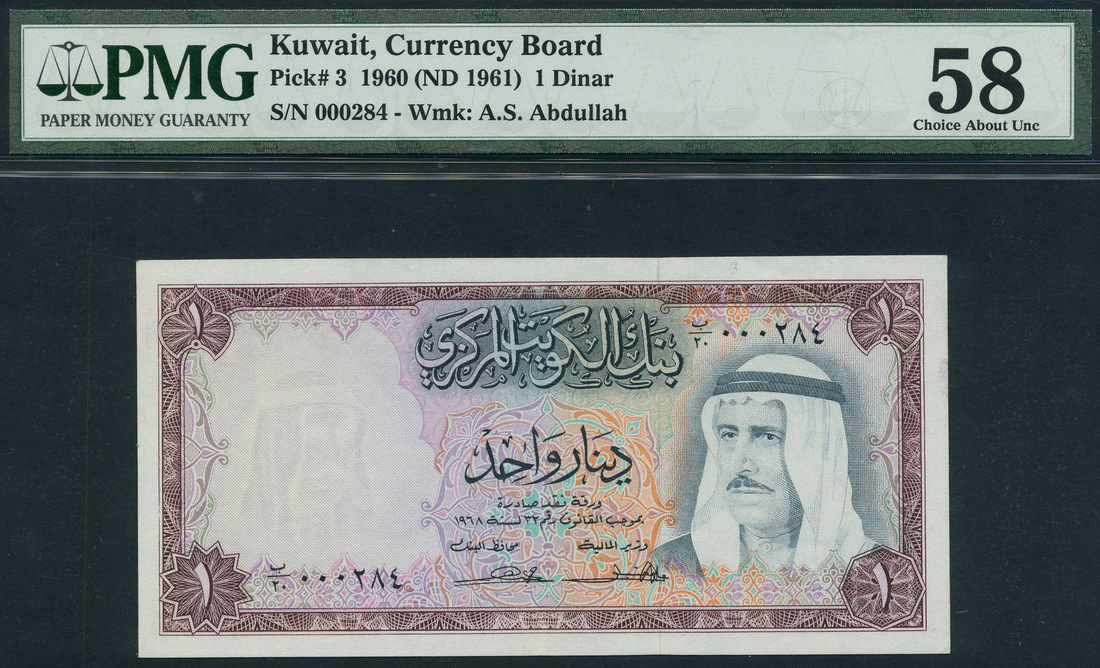 (x) Central Bank of Kuwait, 1 dinar, ND (1971), serial number 000284, purple and multicolour, portrait Sheikh Sabah Al-Salem Al-Sabah at right, ornate border, reverse, oil refinery
