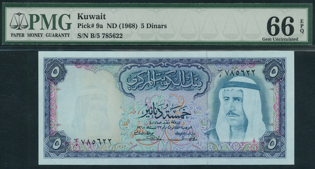 (x) Central Bank of Kuwait, 5 dinars, ND (1968), serial number B/5 785622, blue and multicolour, Sheikh Sabah Al-Salem Al-Sabah at right, reverse blue, street view, Hamza Abba and Abdul Al-Rahman Al-Atiqi signatures