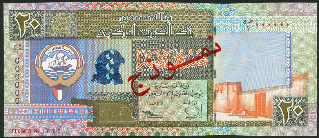 (x) Central Bank of Kuwait, a specimen set of the 5th series, law of 1968 (1994), comprising 1/4 dinar, prefix AE/1, 1/2 dinar, prefix BE/1, 1 dinar, prefix CE/1, 5 dinars, prefix DE/1, 10 dinars, prefix EE/1 and 20 dinars, prefix FE/1, all multicoloured, arms at left, signatures of Salem Abdul Aziz Al-Saud Al-Sabah and Nasir Abdullah al-Rodhan, red Arabic Specimen overprint