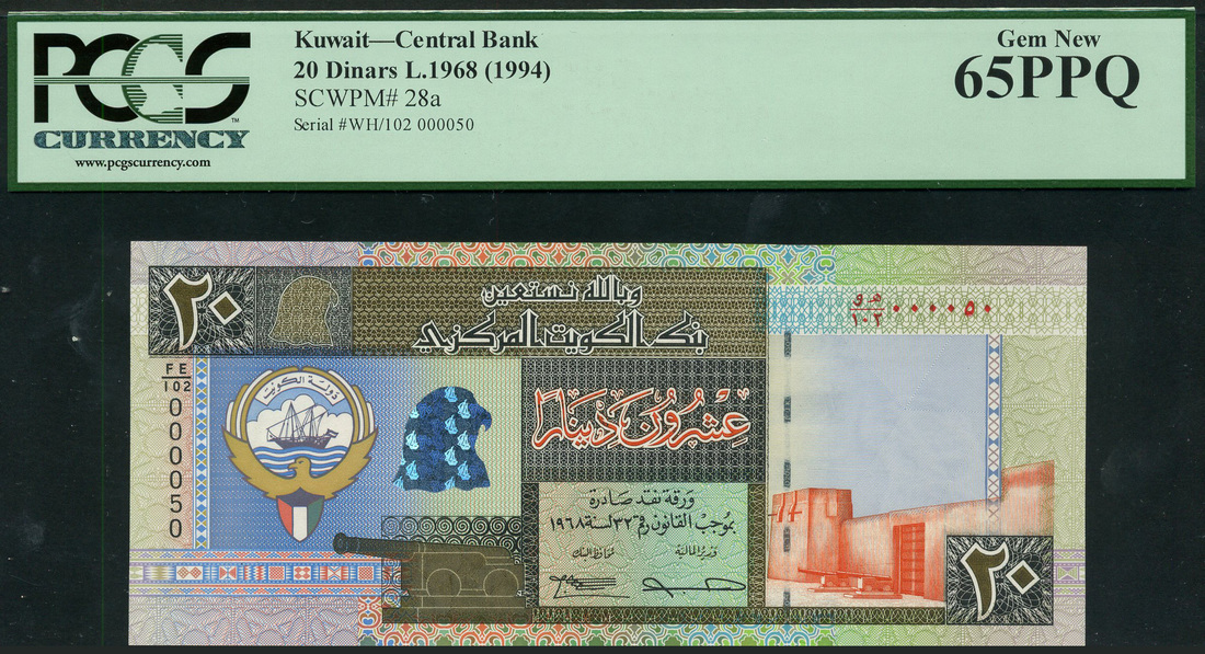 (x) Central Bank of Kuwait, a set of the fifth issue (1994) comprising, 1/4, 1/2, 1, 5, 10, 20 dinars, all with very low matching serial number 000050, each brightly coloured with coat of arms with falcon and dhow at left