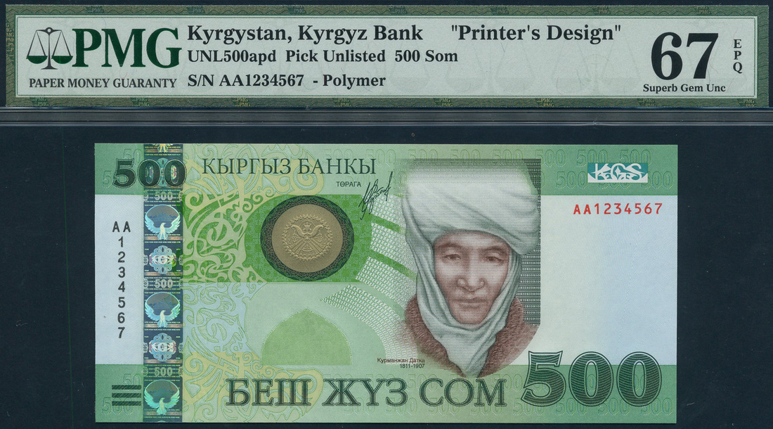 Kyrgyz Bank, Kyrgyzstan, printer's design for 500 som, ND, serial number AA1234567, various shades of green on pale yellow and blue underprint, Czarina Krumanjan-Datka at centre right, reverse, horsewoman with village in background
