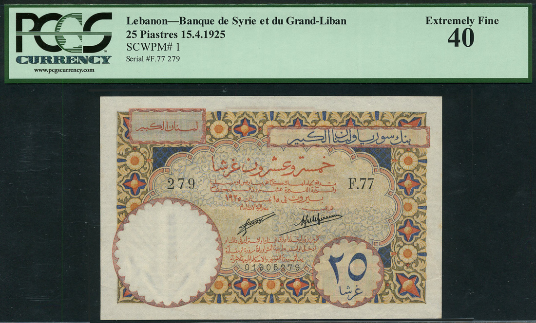 (x) Banque de Syrie et du Grand-Liban, Lebanon, 25 piastres, 1925, serial number F.77 01905279 multicoloured, value in blue low right, Forges and Laferriere signatures, reverse multicoloured, the Mill of Hama at centre, Grand-Liban in blue top centre, French text