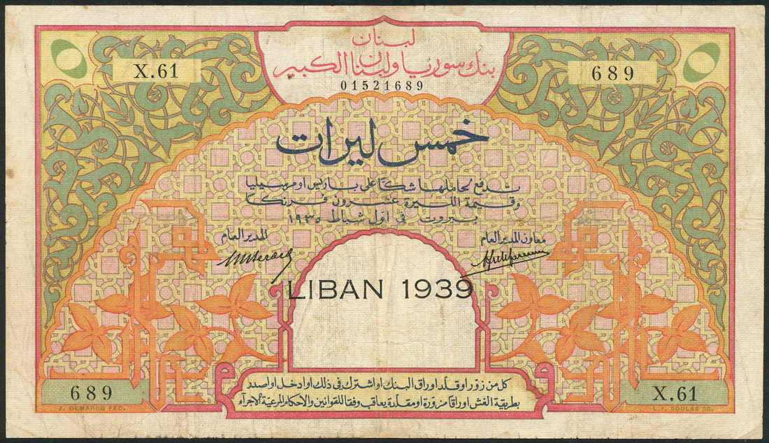 (x) Banque de Syrie et du Grand Liban, Lebanon, 5 livres, 1935, serial number X.61 689, green, orange and pink, elaborate scrollwork in field, Berard and Laferriere signatures, LIBAN 1939 overprint at centre, reverse, building at centre, geometric patterns around, LIBAN at upper centre