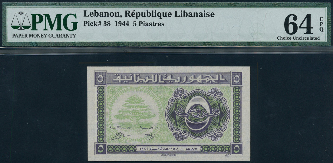 Republique Libanaise, Lebanon, 5 piastres, 1944, no serial number, violet and pale green, cedar tree at left, ornate border with value at each corner, reverse, dark grey, bank title top centre, value in tablet at centre and at top left and right