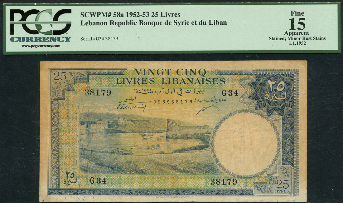(x) Banque de Syrie et du Liban, Lebanon, 25 livres, 1 January 1952, serial number G34 38179, blue on yellow and green, harbour town at centre, reverse blue & orange, stone bridge at centre