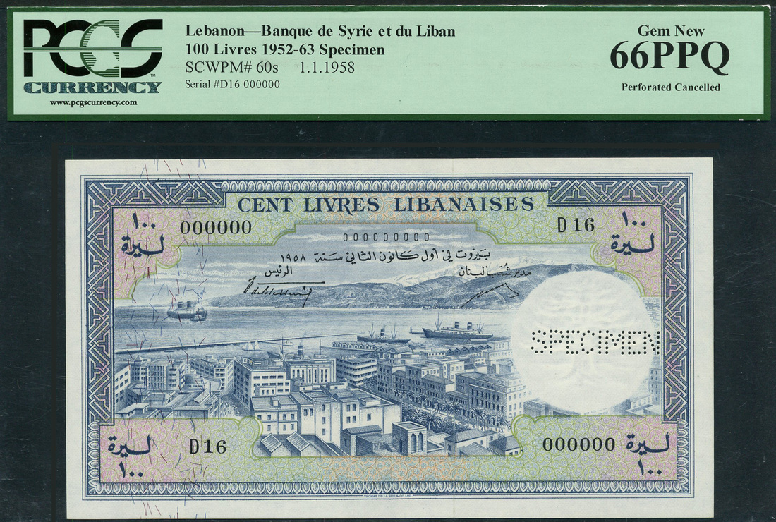 (x) Banque de Syrie et du Liban, Lebanon, specimen 100 livres, 1952, serial number D16 000000, blue and lilac, Beirut harbour at centre, reverse blue, Cedar tree at centre, value at right, perforated SPECIMEN