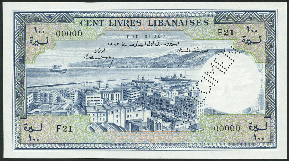 (x) Republique Libanaise, specimen 100 livres, 1952, serial number F21 00000 grey blue on light green and pink underprint, aerial view of Beirut and harbour, mountains in distance, reverse, ornate panel with cedar tree at centre